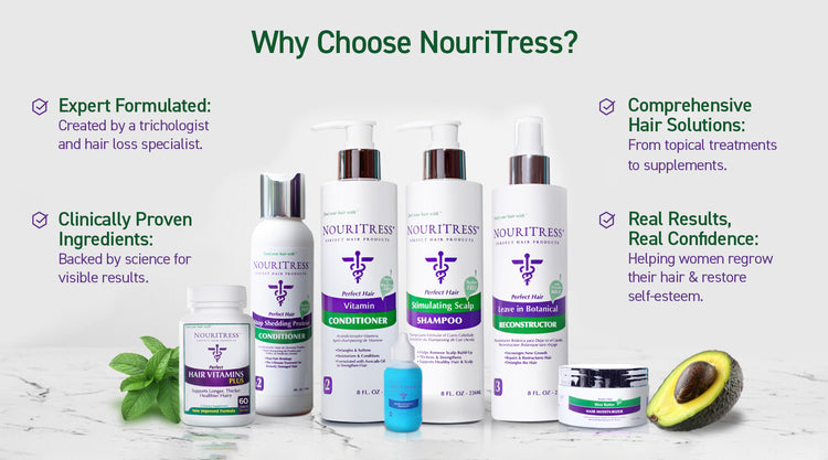 The heart of our brand story lies in our unwavering belief in the power of self-confidence. We understand that a woman’s hair is tied to her confidence, so each NouriTress product is thoughtfully created to deliver not only visible results but also a sense of hope. Our commitment extends beyond just hair restoration — we transform lives, foster a sense of self-confidence and self-love that radiates from the inside out. From our revitalizing shampoos that provide the ultimate scalp care to our hair vitamin supplements that provide healthy hair from within, NouriTress Products are designed with care for the scalp. As we continue to evolve and grow, our brand story remains rooted in building confidence and giving women back their smiles.