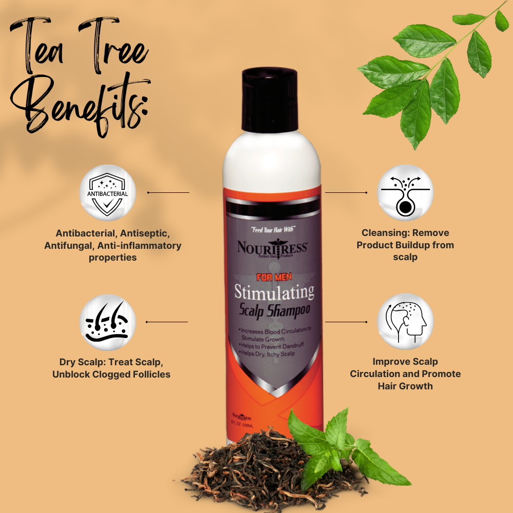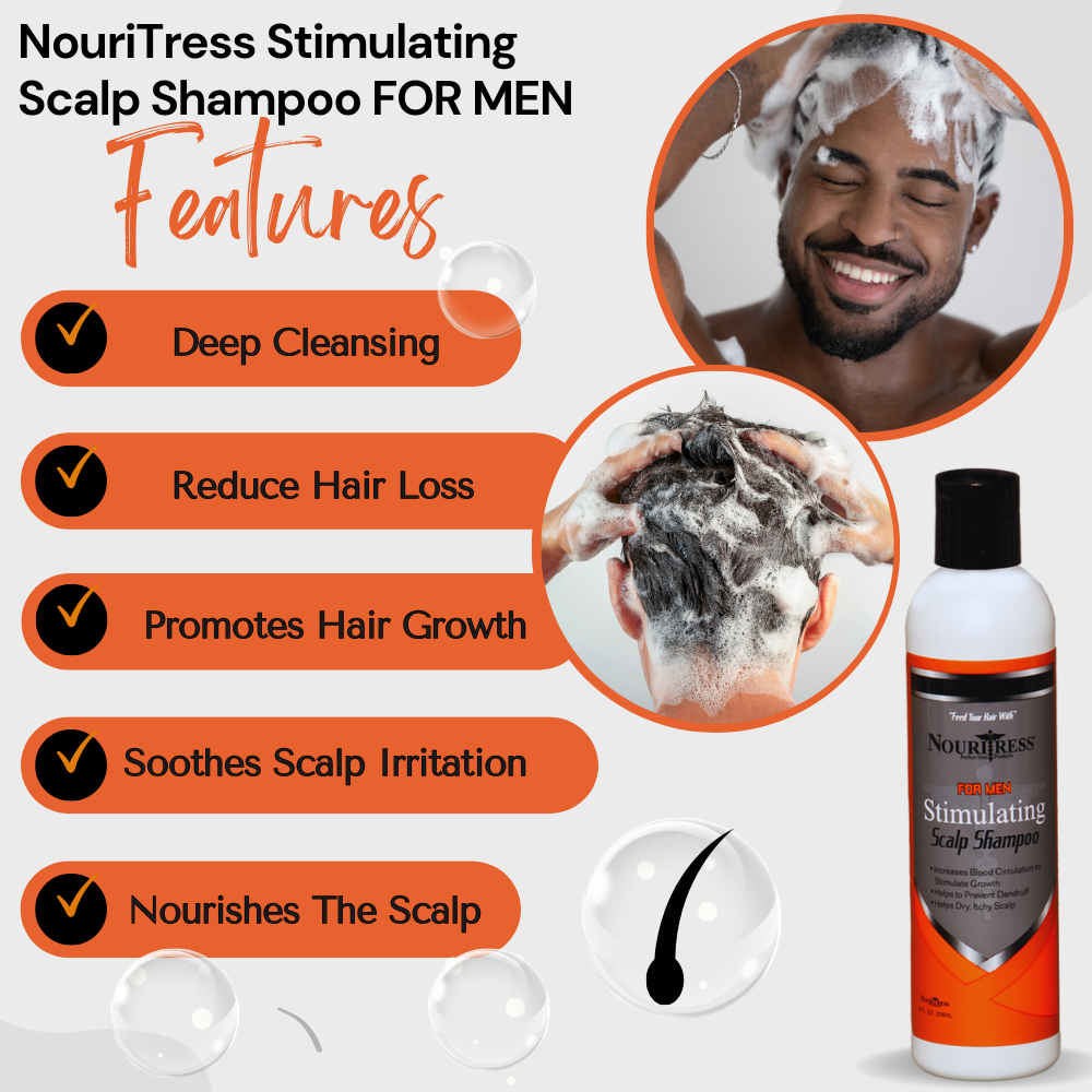 Le shampooing stimulant pour le cuir chevelu NouriTress pour HOMMES est un shampooing thérapeutique pour les cheveux et le cuir chevelu avec une formule thérapeutique unique conçue pour nettoyer en profondeur les cheveux et le cuir chevelu. Formulé avec du camphre, le shampooing stimulant pour le cuir chevelu favorise la croissance, aide à débloquer les follicules obstrués, apaise et protège le cuir chevelu sec et irrité. Votre cuir chevelu se sentira rajeuni après une seule utilisation.